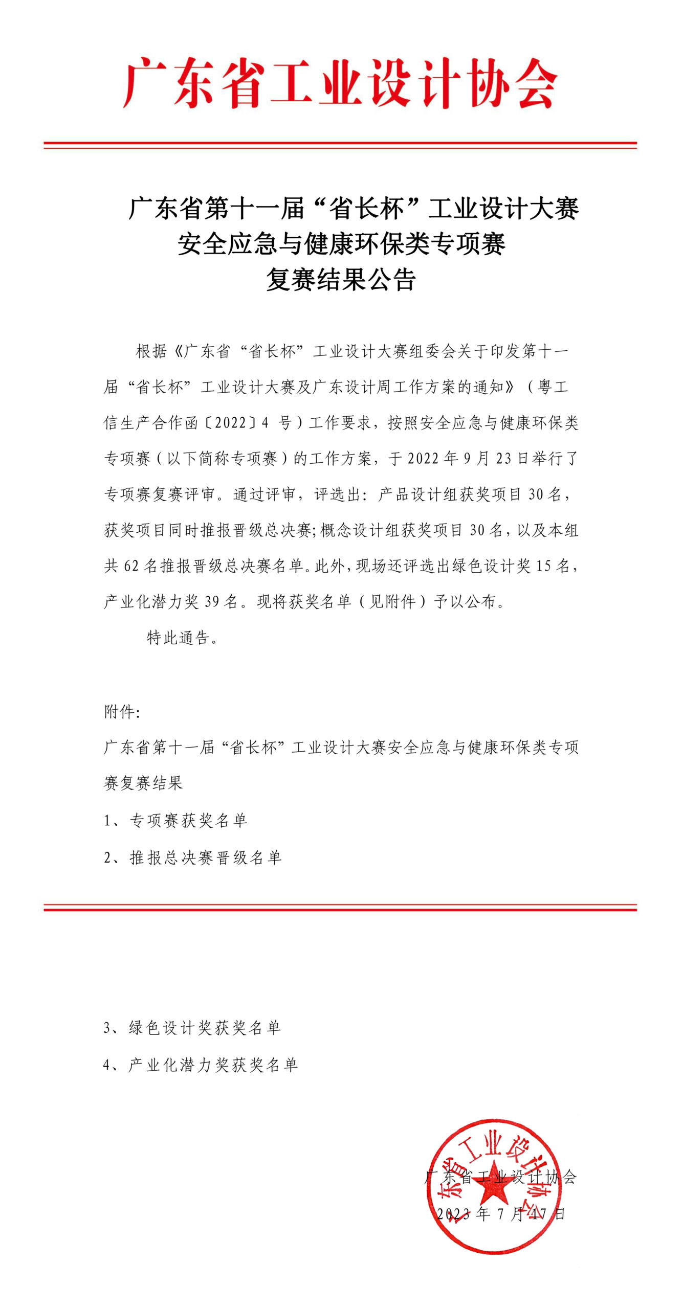 广东省第十一届“省长杯”工业设计大赛安全应急与健康环保类专项赛复赛结果公告